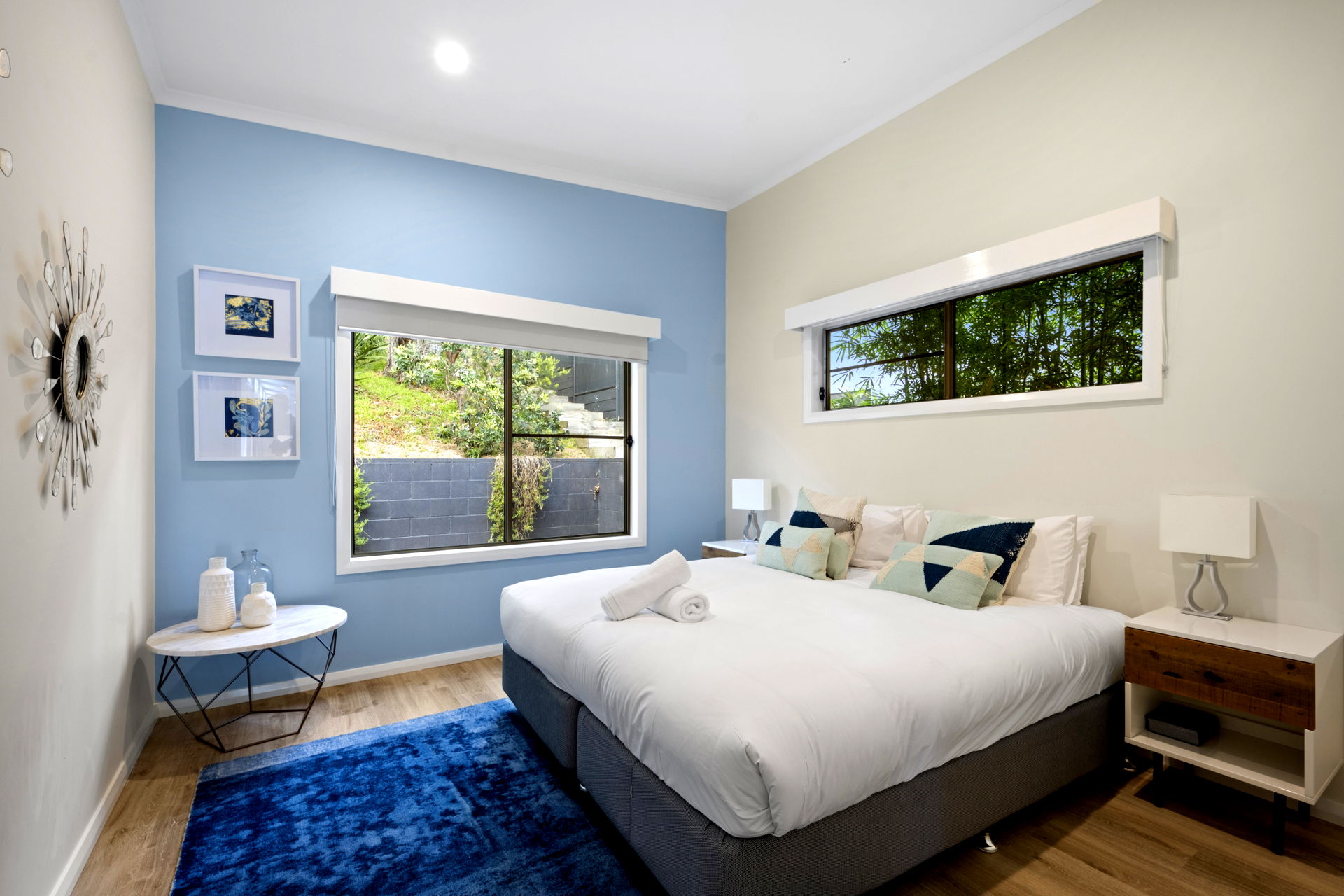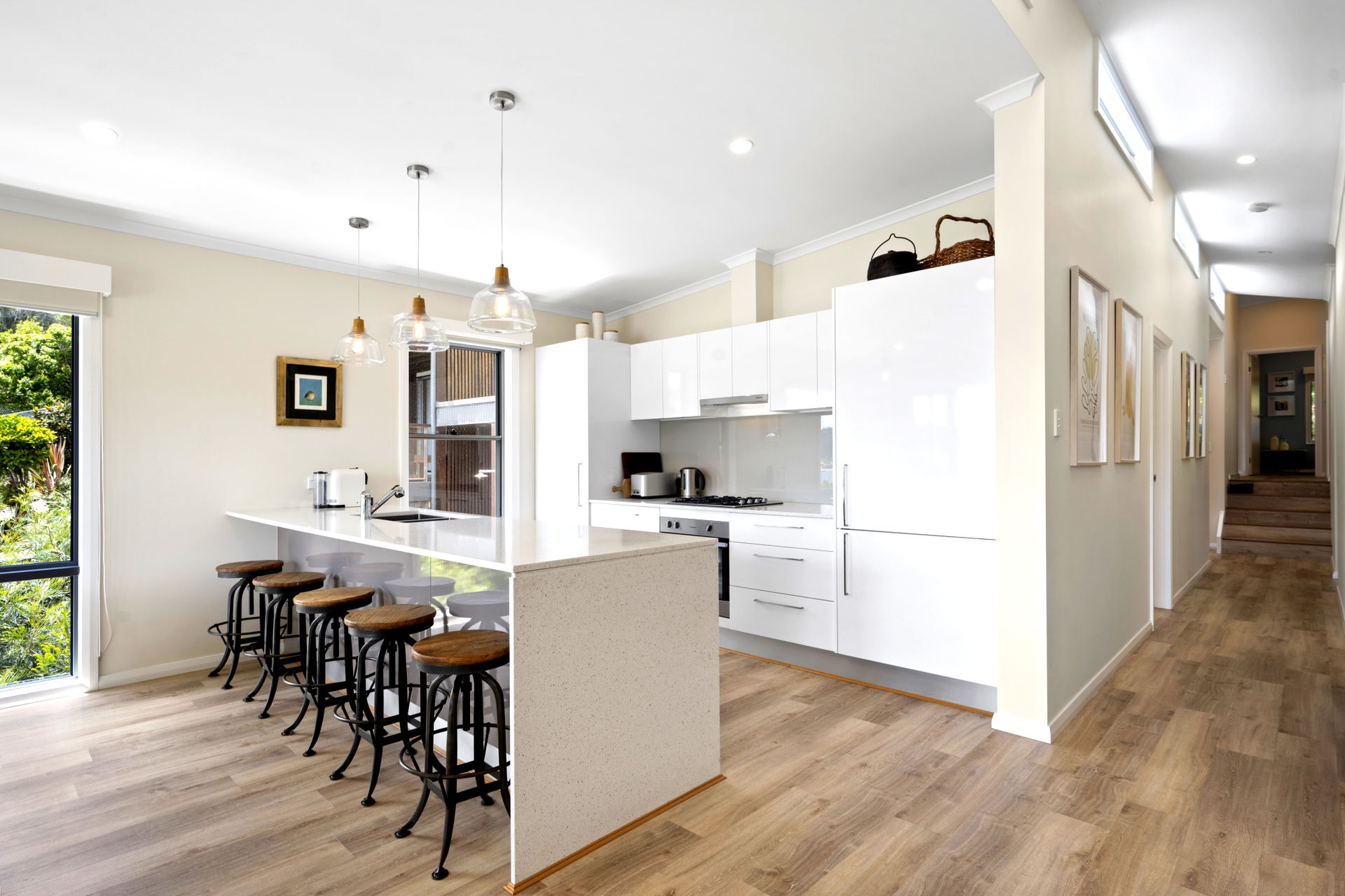 The floorplan includes a stunning combined living/dining area that effortlessly flows out to the entertaining deck overlooking Pretty Beach. The spacious kitchen features updated quality appliances and stone counter tops, while there is a gas barbecue outside for cooking up your ‘catch of the day’. Stylishly decorated, the interior is kept cosy during the cooler months with an Eco-friendly gas fireplace.