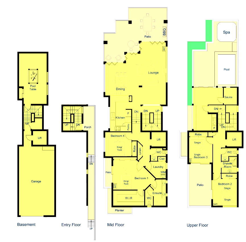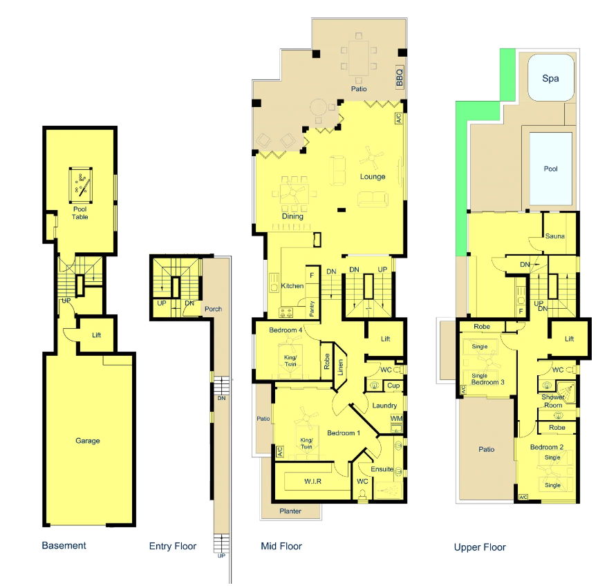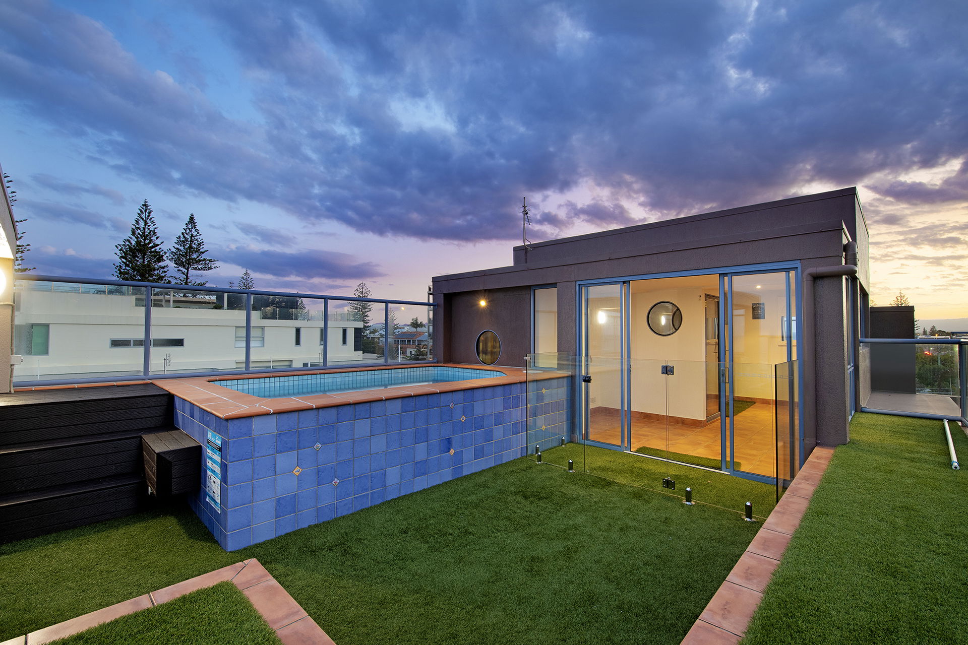 Beachfront Escape provides 4 large bedrooms split across 2 floors, 2.5 bathrooms, split cycle air conditioning in all rooms, large indoor/outdoor alfresco living. The swimming pool, sauna, and spa are located on the top floor, providing stunning views of the beach and coastline, with the bonus of a pool table in the basement for added entertainment and a lift for easy access to all floors.