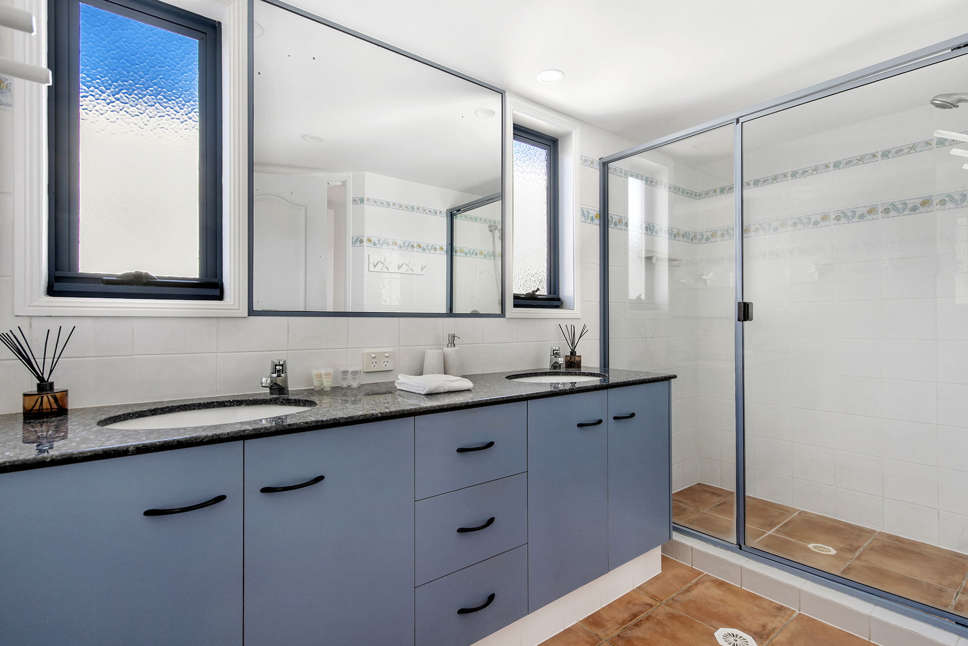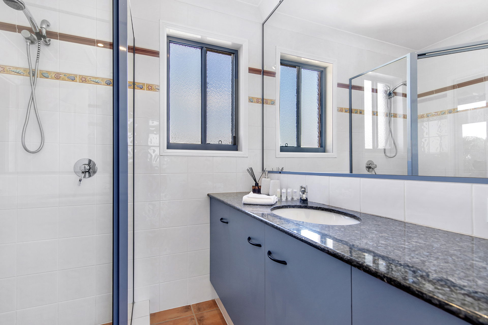 The second floor is designed to take advantage of indoor-outdoor living and the spectacular views. The open floor plan of the kitchen, dining, and living spaces is enhanced by the natural light through the expansive windows and doors. These in turn lead out to the alfresco dining and entertaining area, with the stunning beachfront backdrop. Down a small flight of stairs, you’ll find the master bedroom with its ensuite, the 4th bedroom and a laundry.