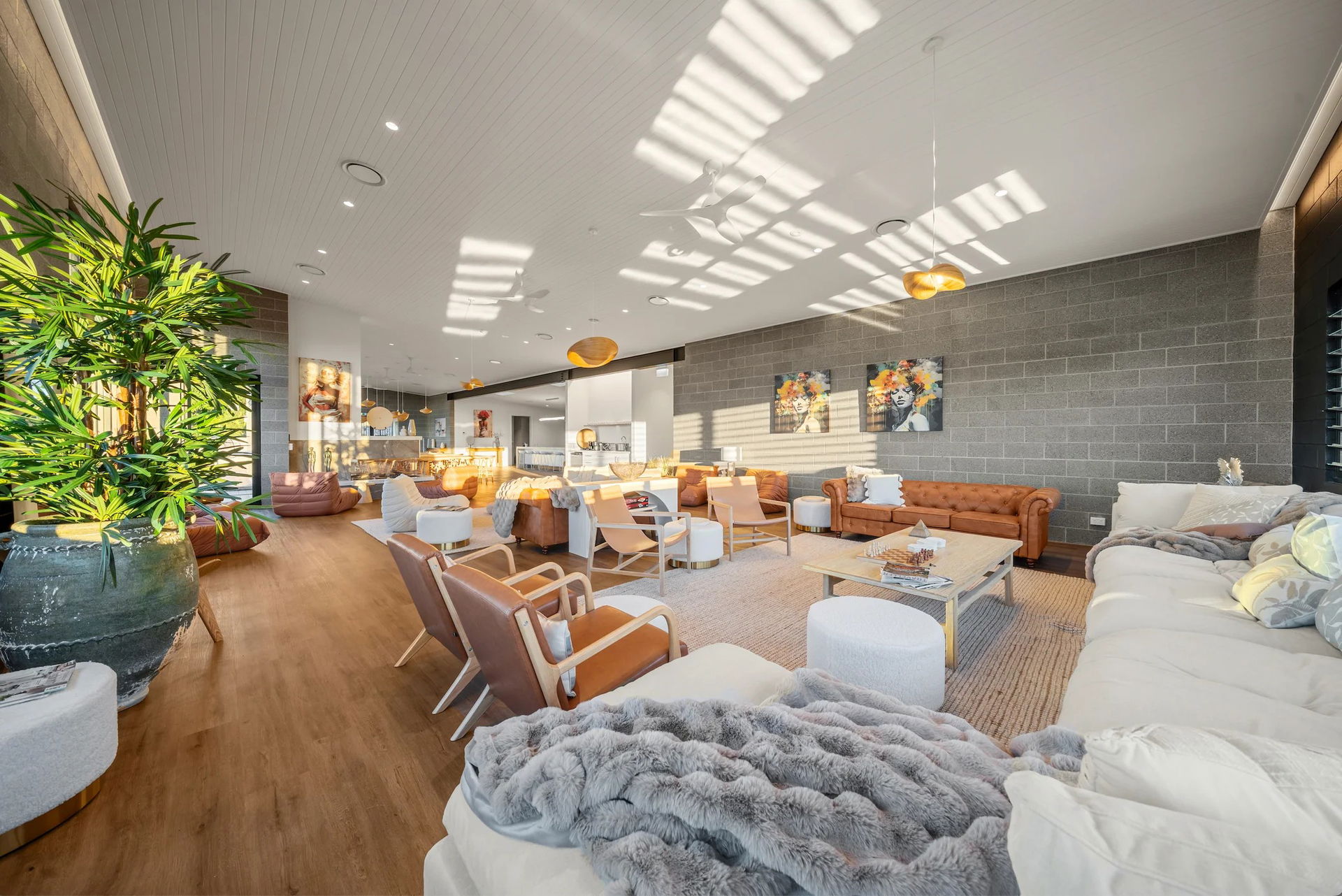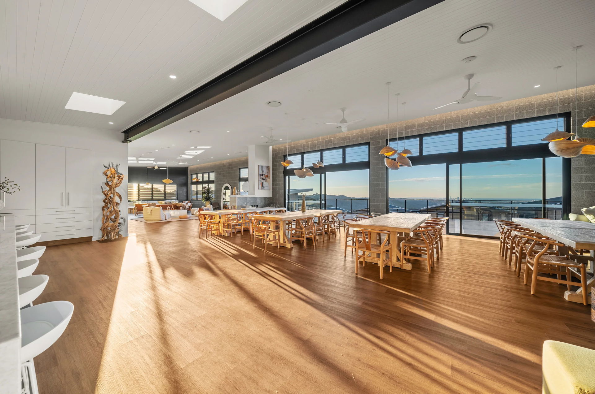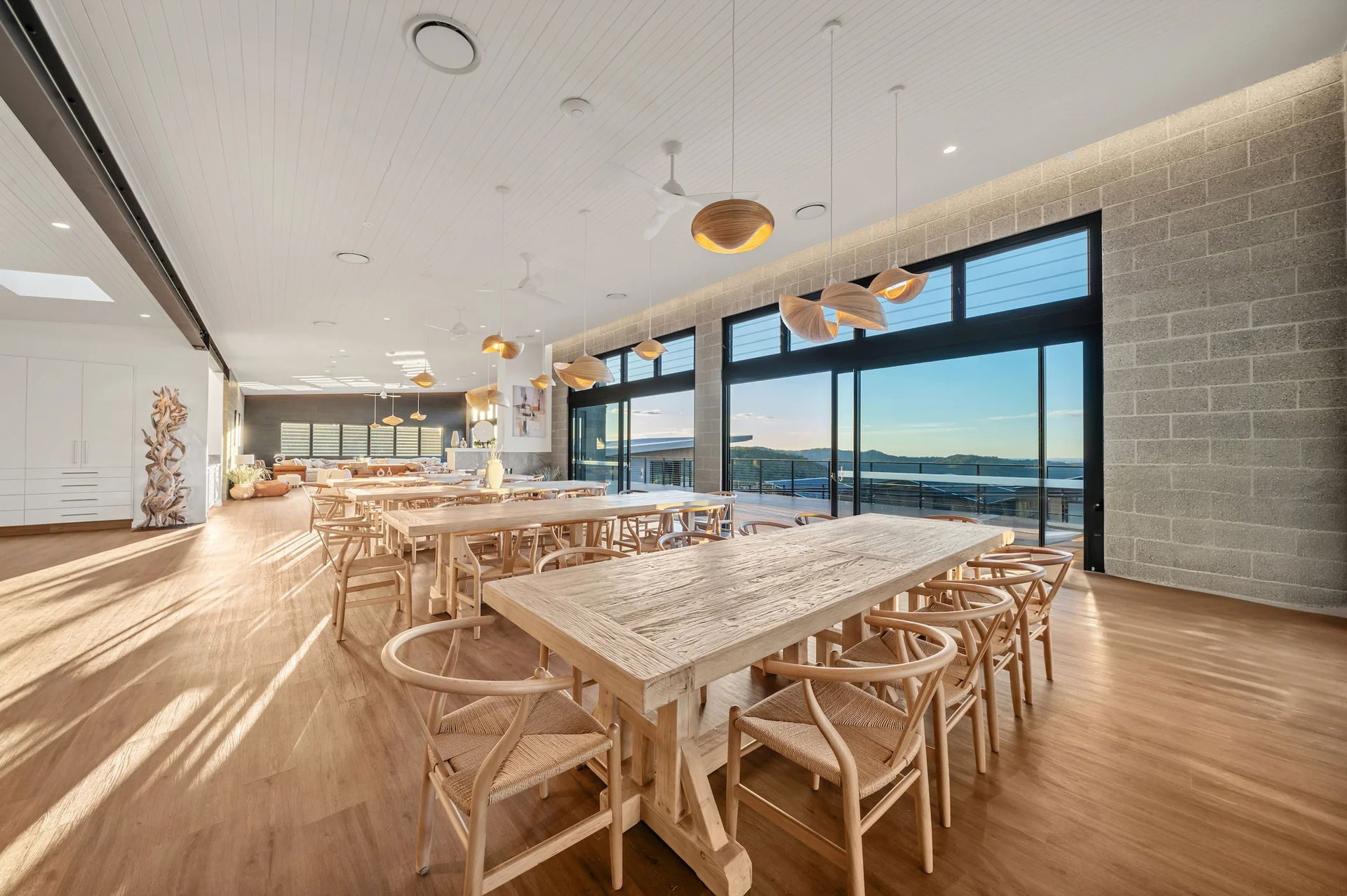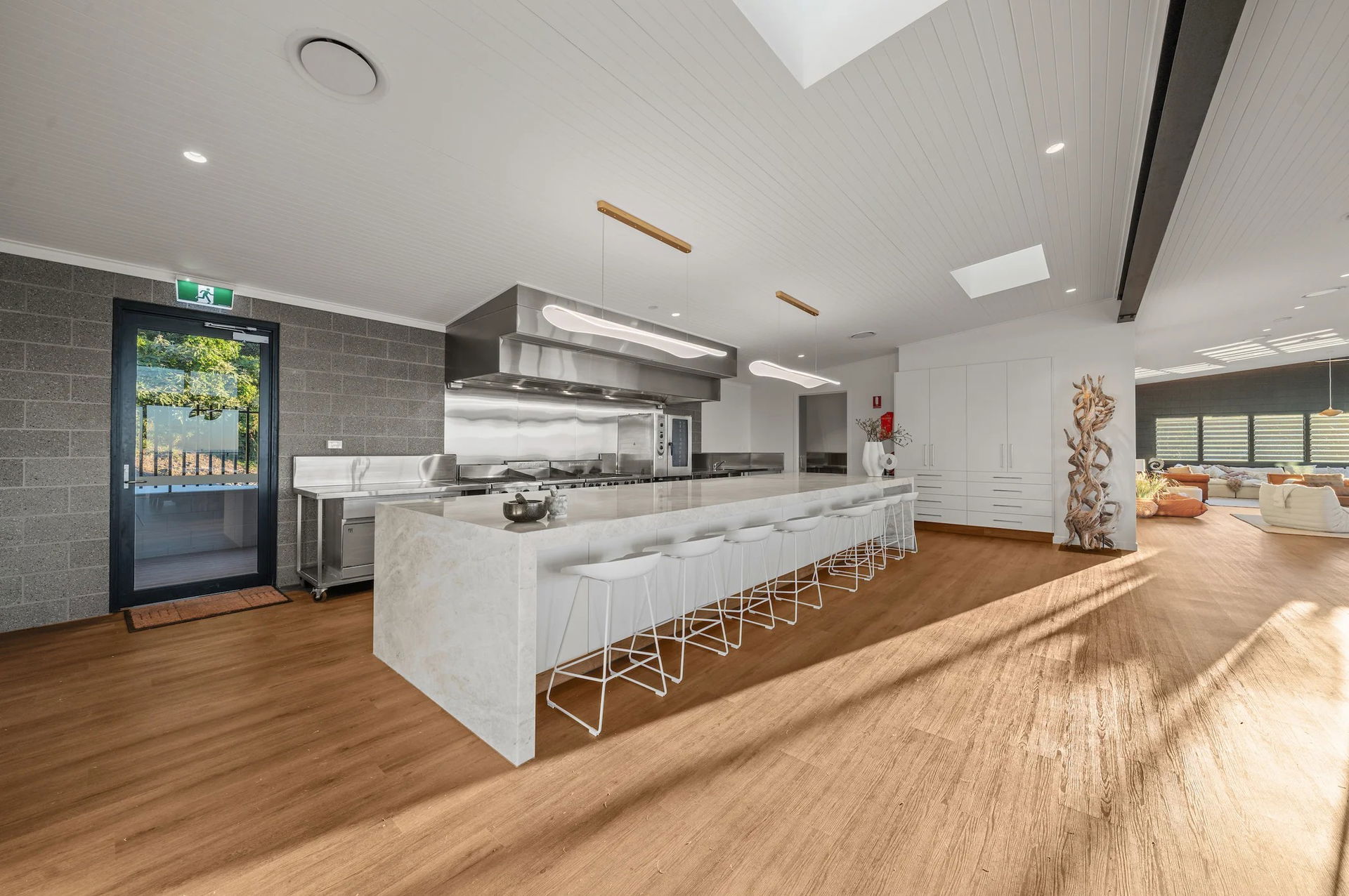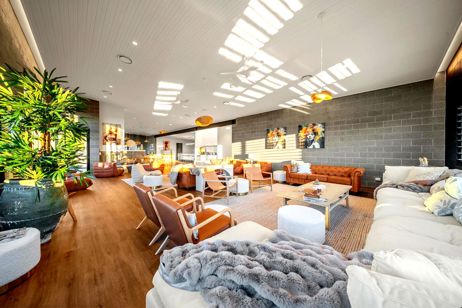 Valley Room: yoga and meditation studio. A large open room with timber floors and eastern exposure ideal for sunrise classes and gentle workshops. Breeze Room: functional gym. A completely equipped fully functional gym with free weights, power rack and all the essentials. The Breeze Room also doubles as a space for yoga training and high energy group coaching classes. Chef’s Kitchen: communal kitchen for group dining and experiences. Big Lounge and Big Living Room: a series of breakout spaces with comfortable couches, tables and chairs, ideal for smaller groups, presentations, or a space to simply unwind and talk quietly. Six multipurpose breakout rooms in total. All breakout rooms are located away from villa units to minimise disturbance and disruption.