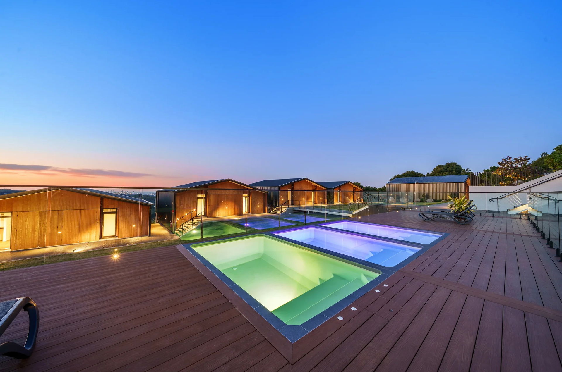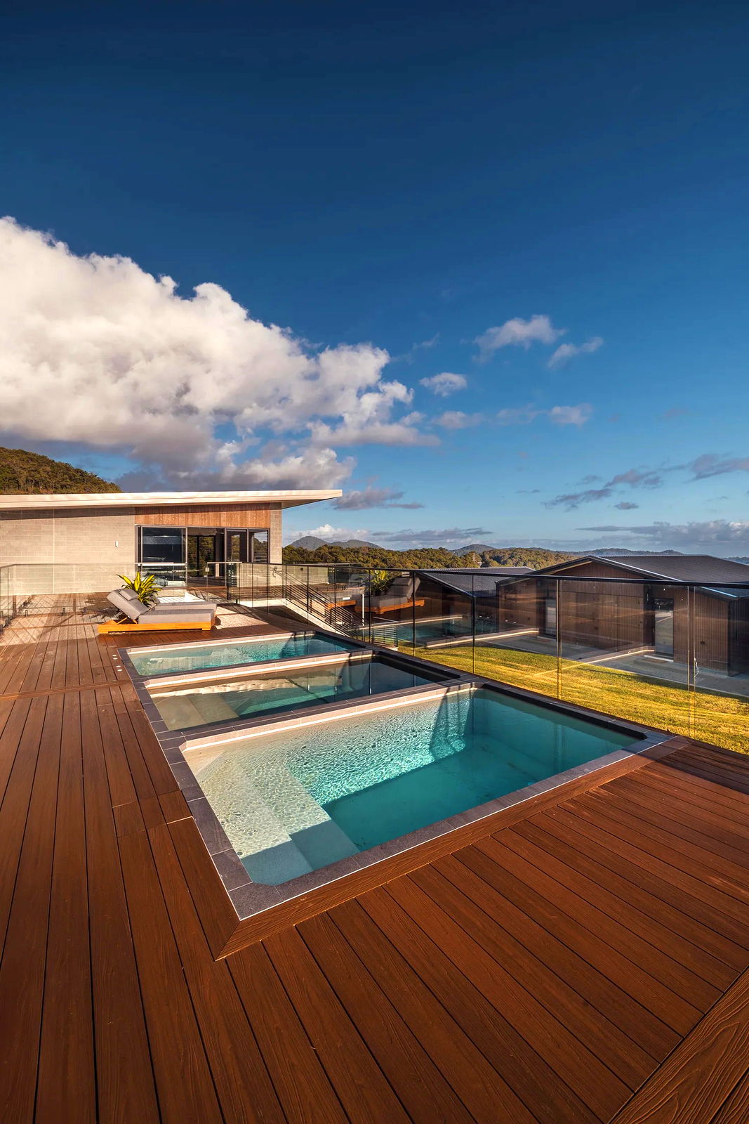 Three plunge pools and sun-drenched pool decks. A series of plunge pools and pool decks are built into the side of the valley for sheltered cooling down under the open sky. Infrared Saunas. A series of intimate infrared saunas are provided for added recovery and relaxation. Viewing decks and walking tracks. A series of walking tracks and viewing decks meander through the site and the valley, leading to a viewing platform with prolific birdlife.