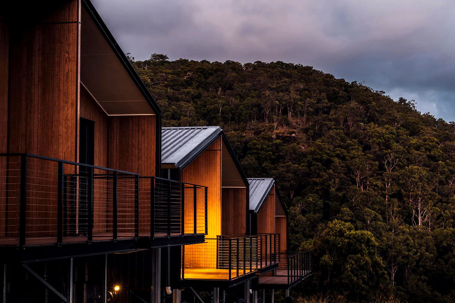 15 private eco villas. The villas are spread throughout the valley site with long axis aligning to the views, for maximum privacy. Finishes are natural with bespoke touches: each room has its own private deck and views; air-conditioning; cotton sheets and towels; ensuite bathrooms with private toilet; hairdryer, tea/coffee maker and mini fridge; comfortable couches and ironing board and facilities. Entertainments include large flat screen smart TVs with casting capabilities. Villa 1 is an accessible villa with king bed, Villas 2 and 3 are king bed that convert to king singles, Villas 4 to 15 have 2 queen beds each. Accommodates up to 30 guests.