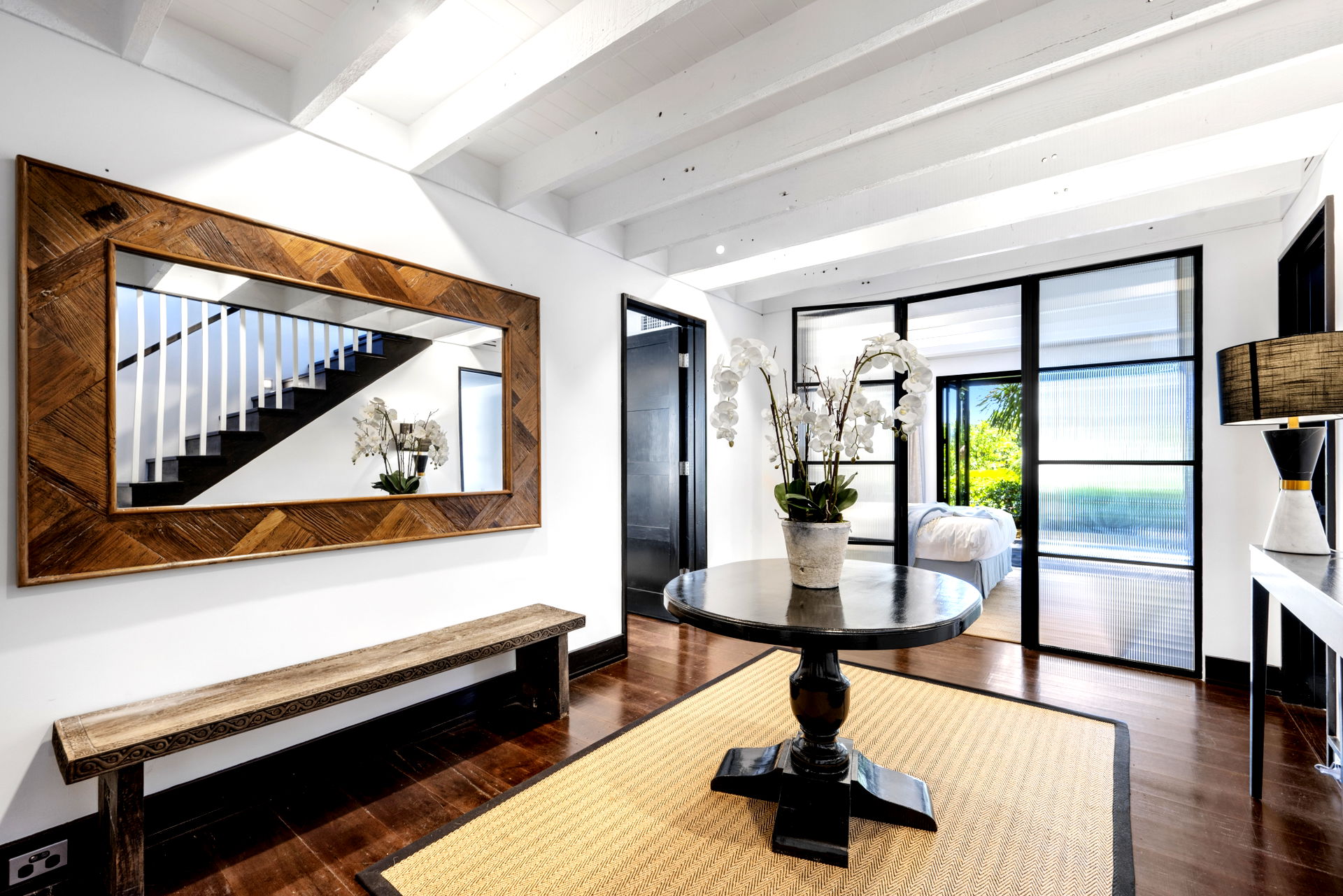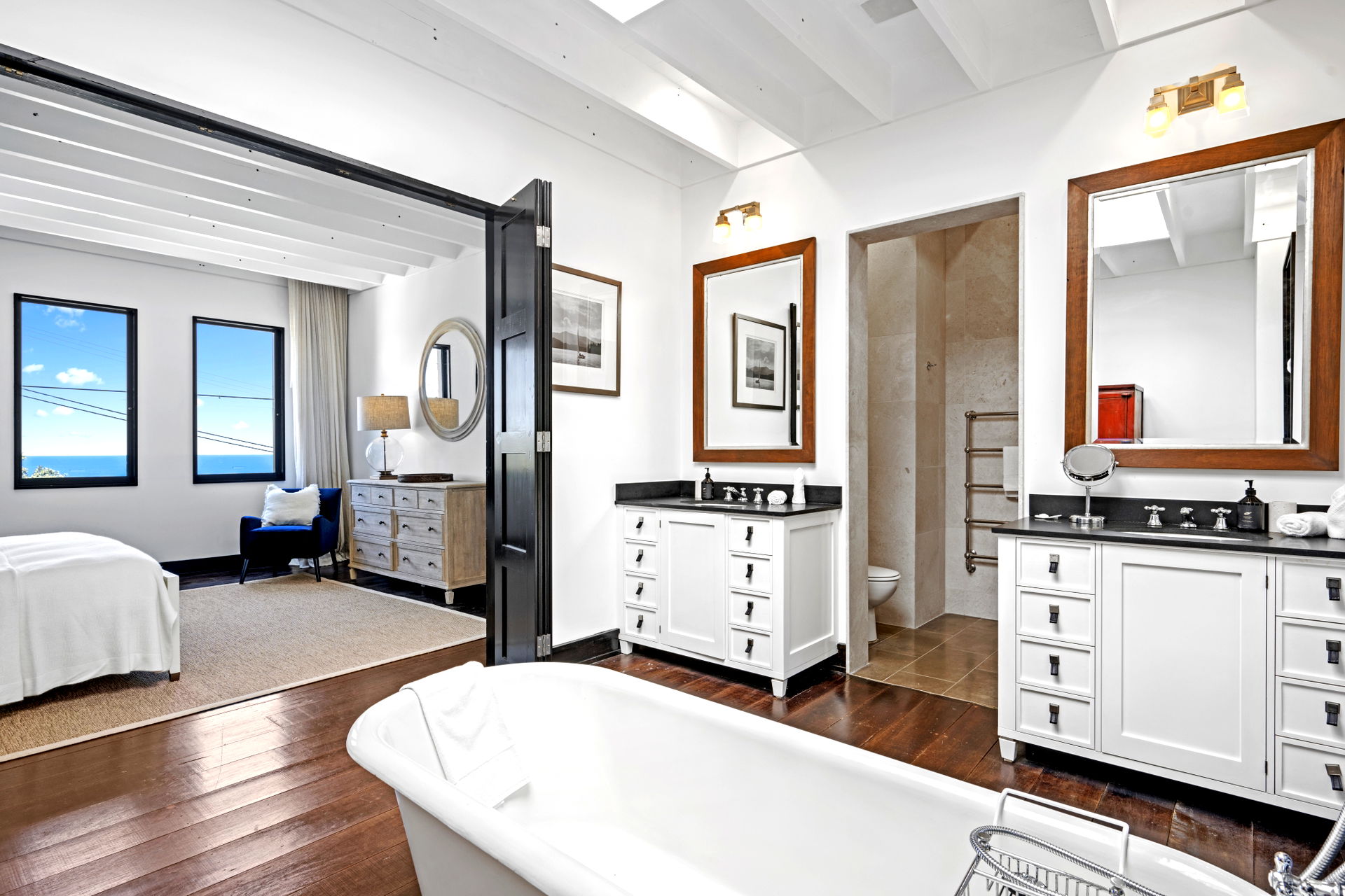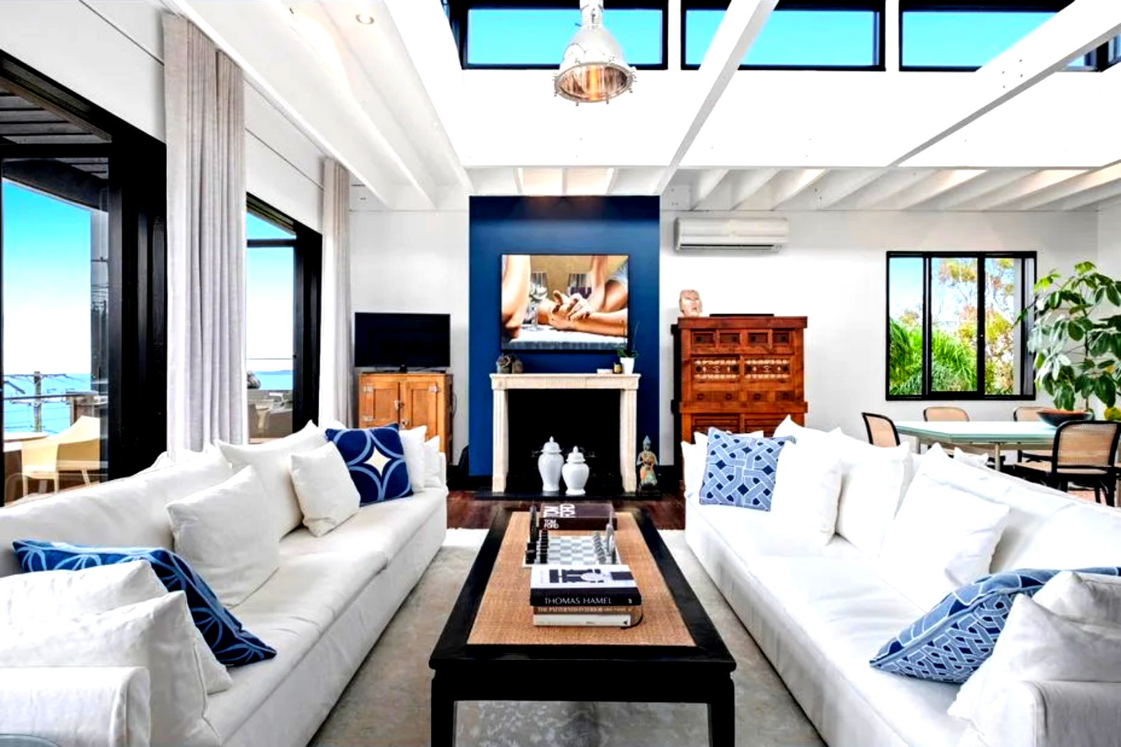 This retreat is refined and polished, the open interiors were designed by Thomas Hamel and are the definition of understated elegance; showcasing a lofty atrium design, the antique hardwood floors and extensive glazing on either end frame those unforgettable views.