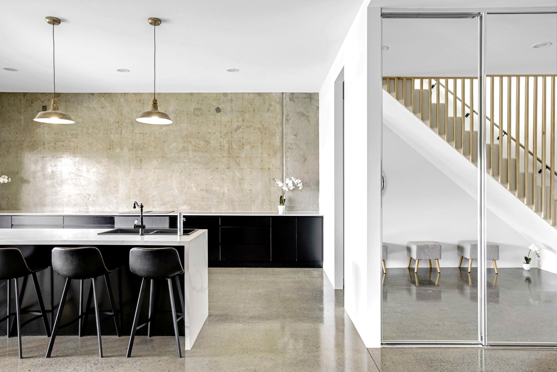 The home's stunning design features rendered concrete walls, barn-style doors, and expansive windows that flood the space with natural light. The open-plan living area seamlessly flows onto the outdoor space, where you can take in breathtaking canal views. The sleek, fully equipped kitchen features modern appliances, including a coffee pod machine, and a compact integrated dishwasher.