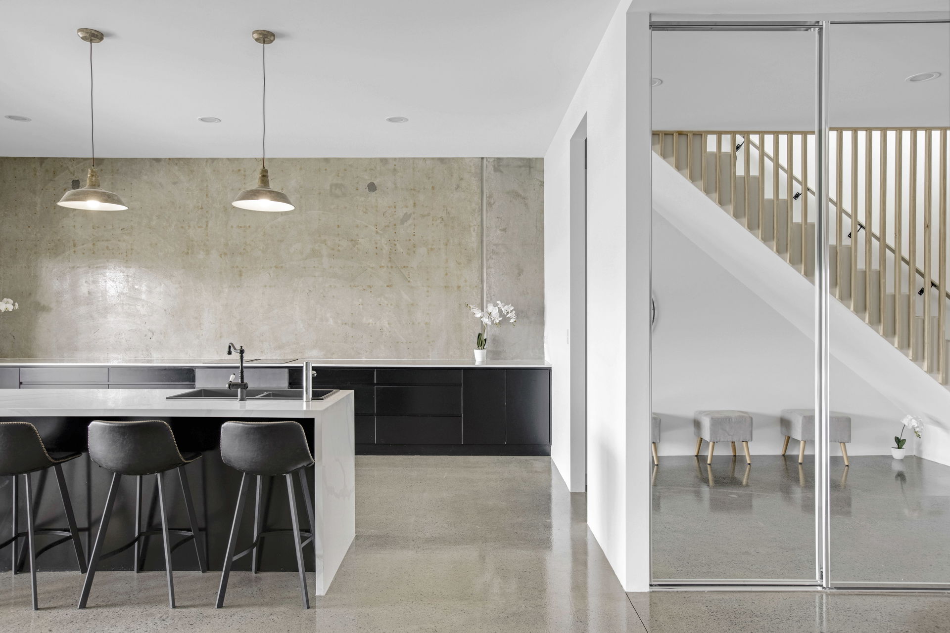 The home's stunning design features rendered concrete walls, barn-style doors, and expansive windows that flood the space with natural light. The open-plan living area seamlessly flows onto the outdoor space, where you can take in breathtaking canal views. The sleek, fully equipped kitchen features modern appliances, including a coffee pod machine, and a compact integrated dishwasher.